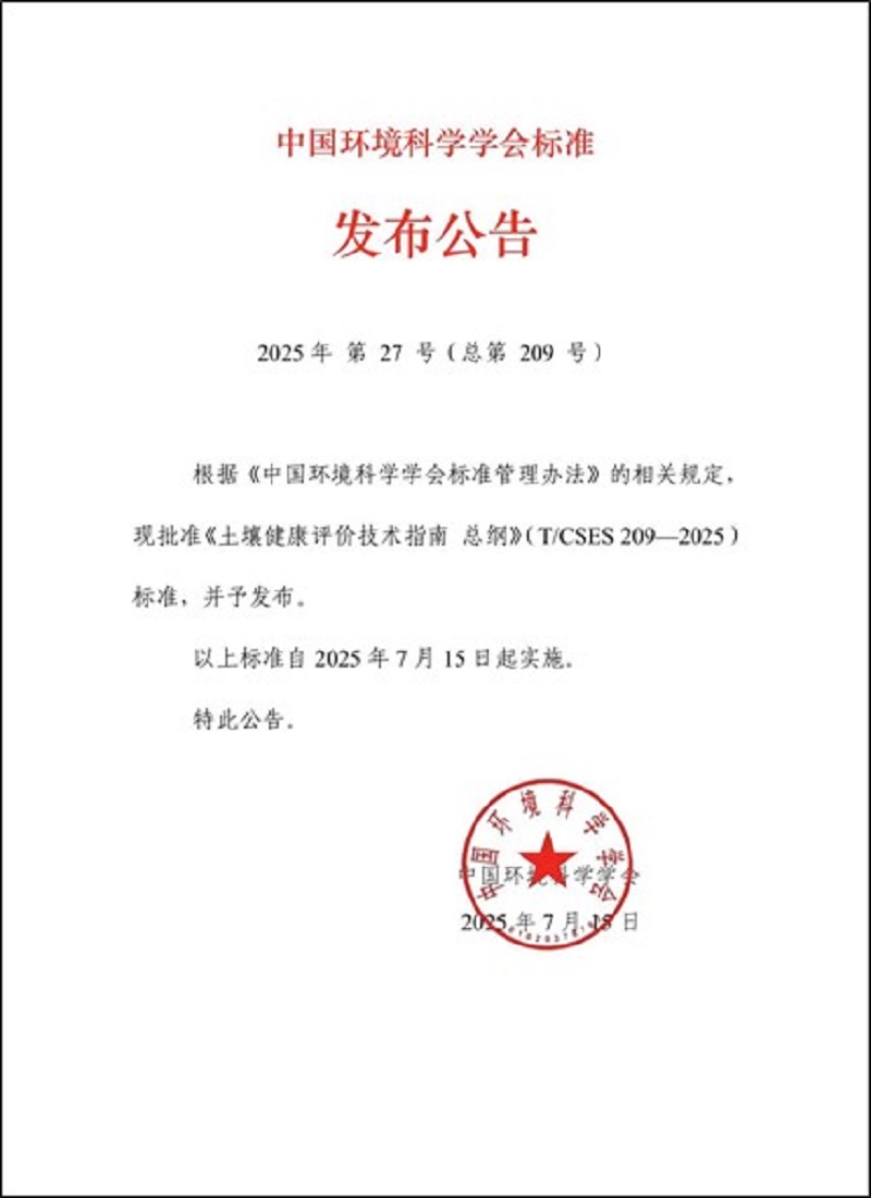 7月15日,经中国环境科学学会批准,生态环境部华体育中心概况牵头,华体育中心概况嘉善双碳创新研究院、中国科学院生态环境研究中心、中国农业科学院农业资源与农业区划研究所、内蒙古雷石环保科技有限公司联合编制的《土壤健康评价技术指南 总纲》(T/CSES 209-2025)团体标准正式发布实施。